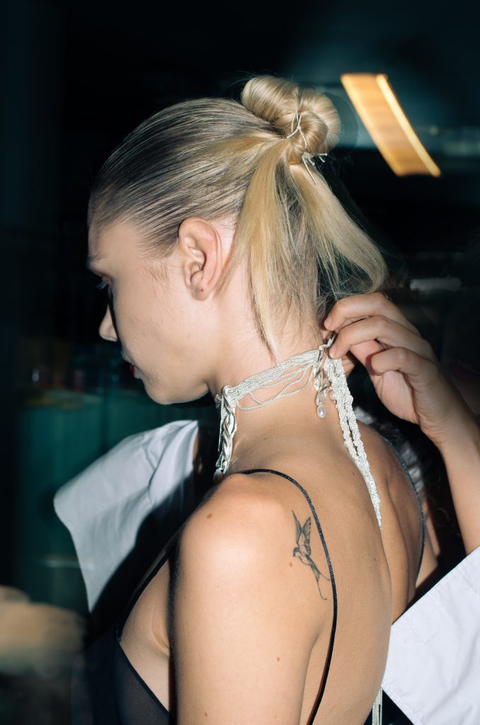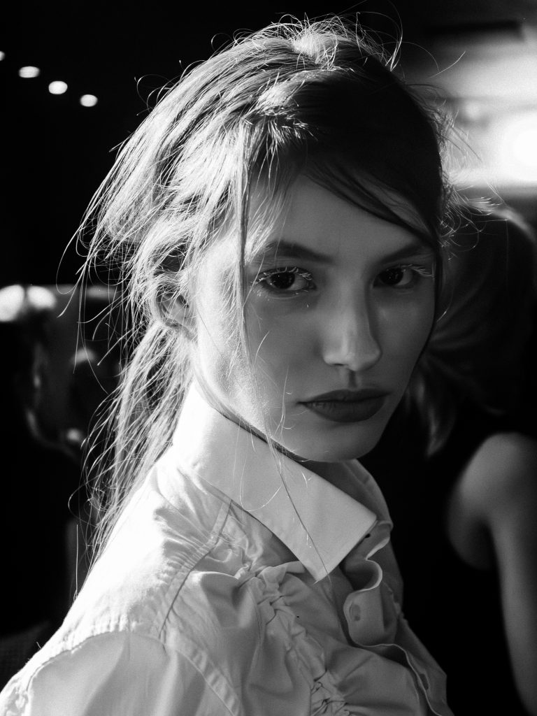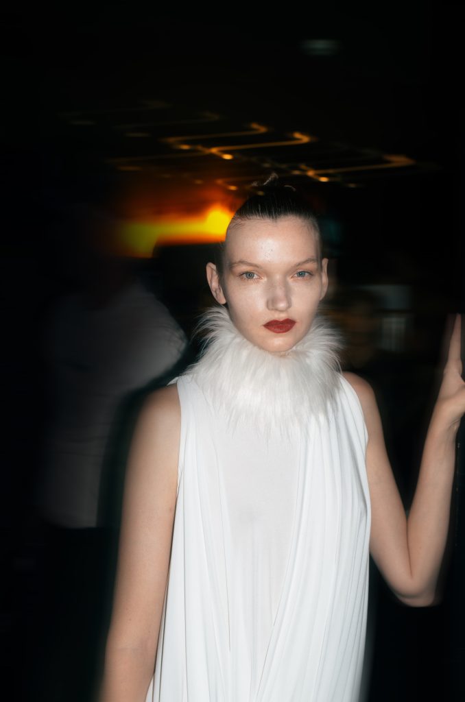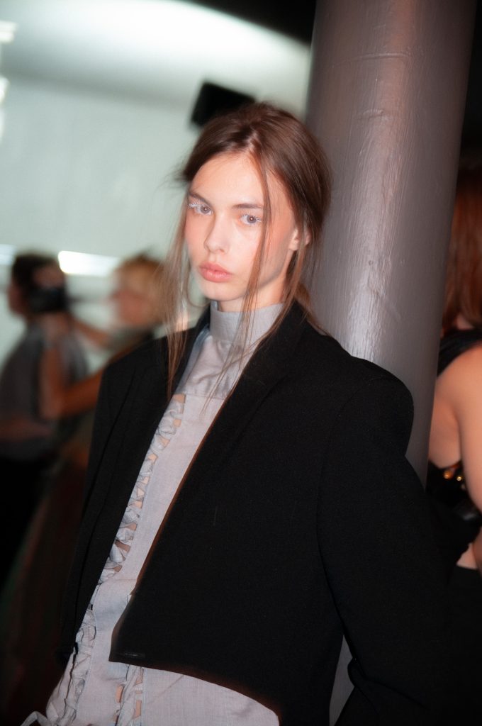 Značka On The Boat přinesla na molo jeden z nejvýraznějších beauty looků fashion weeku. Dramaticky bílé řasy okamžitě upoutaly pozornost a dodaly tvářím až chladný výraz, zatímco pleť zůstala přirozená s jemným růžovým tónem na tvářích i rtech. Vlasy působily ledabyle, jako by modelky právě opustily postel – efekt “messy hair, don’t care” dodal celému looku syrovost a nespoutanost.