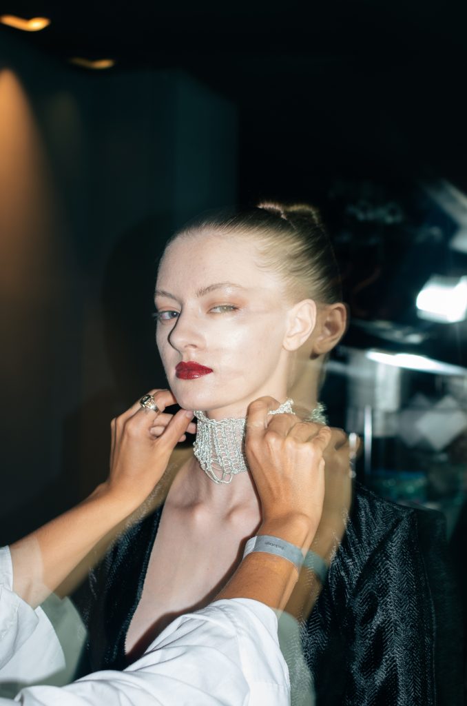 Stejně jako samotná kolekce, i beauty look na přehlídce Tomáše Němce pracoval s kontrastem a dramatem. Uhlazené vlasy do trčícího drdolu nechávaly vyniknout symetrii obličeje, glowy pleť působila téměř bezchybným dojmem a oči byly jen lehce vystínované do teplých bronzových tónů. Jediným skutečně výrazným prvkem byla červená rtěnka – jednotný akcent všech modelek.